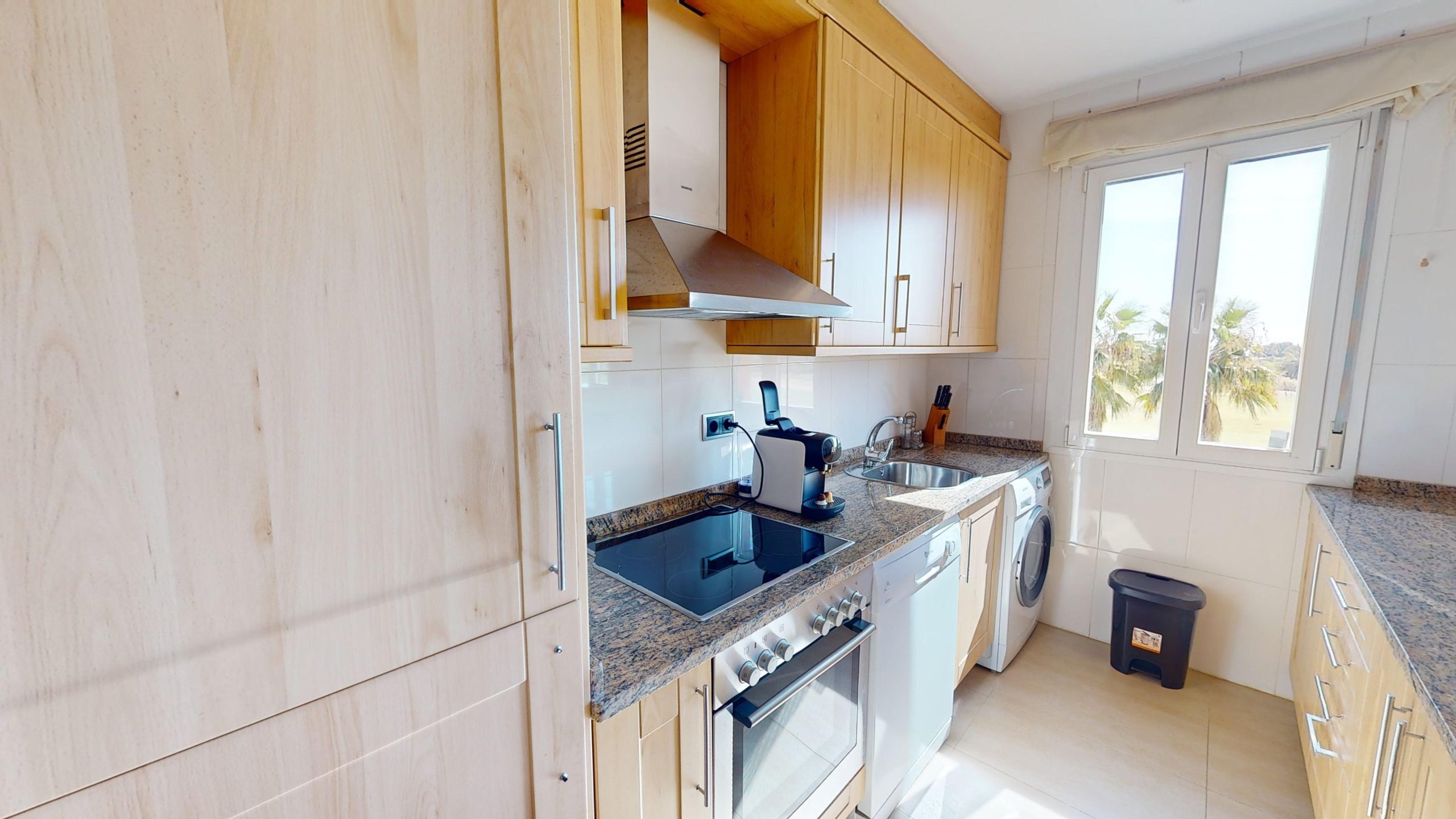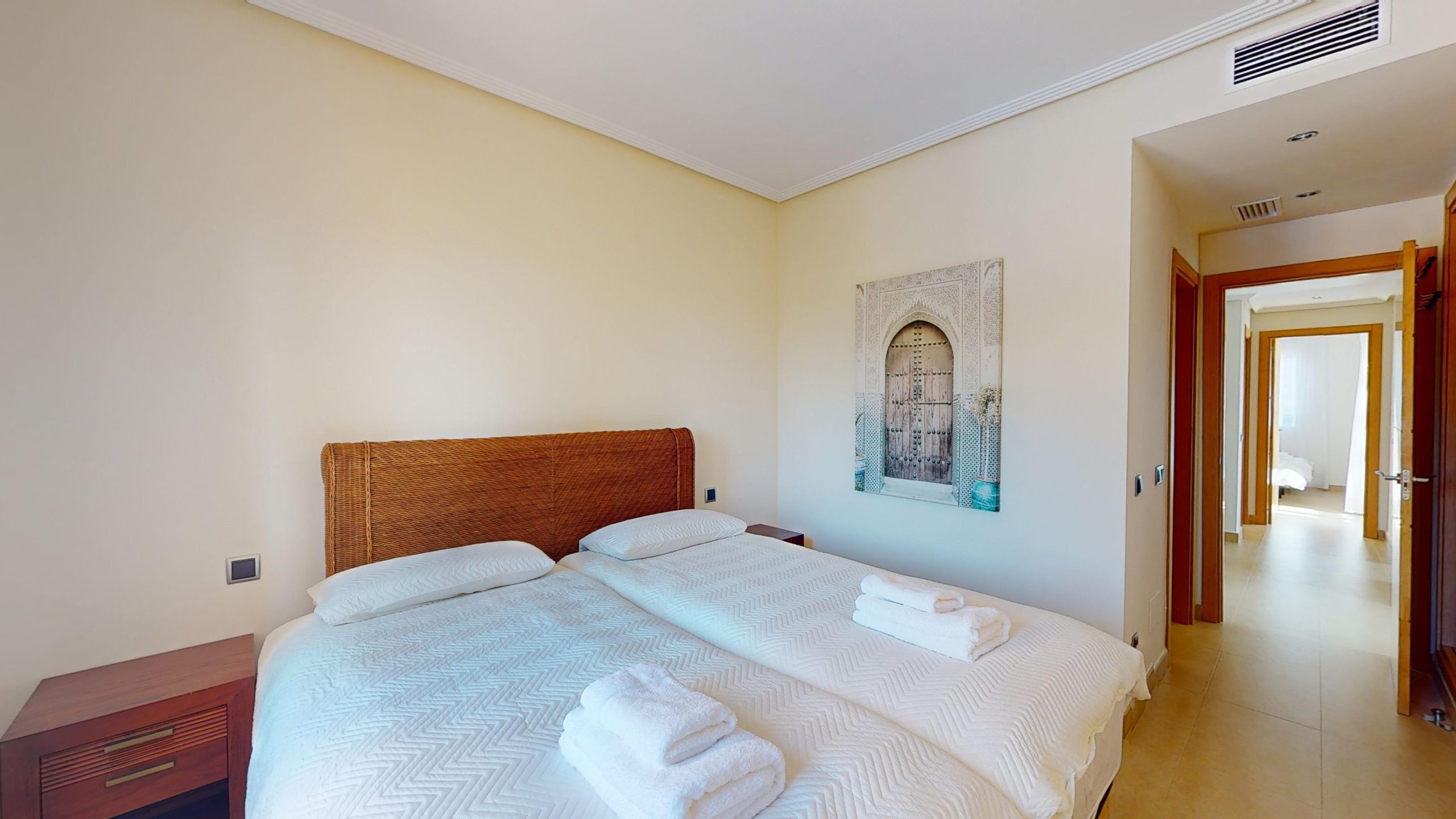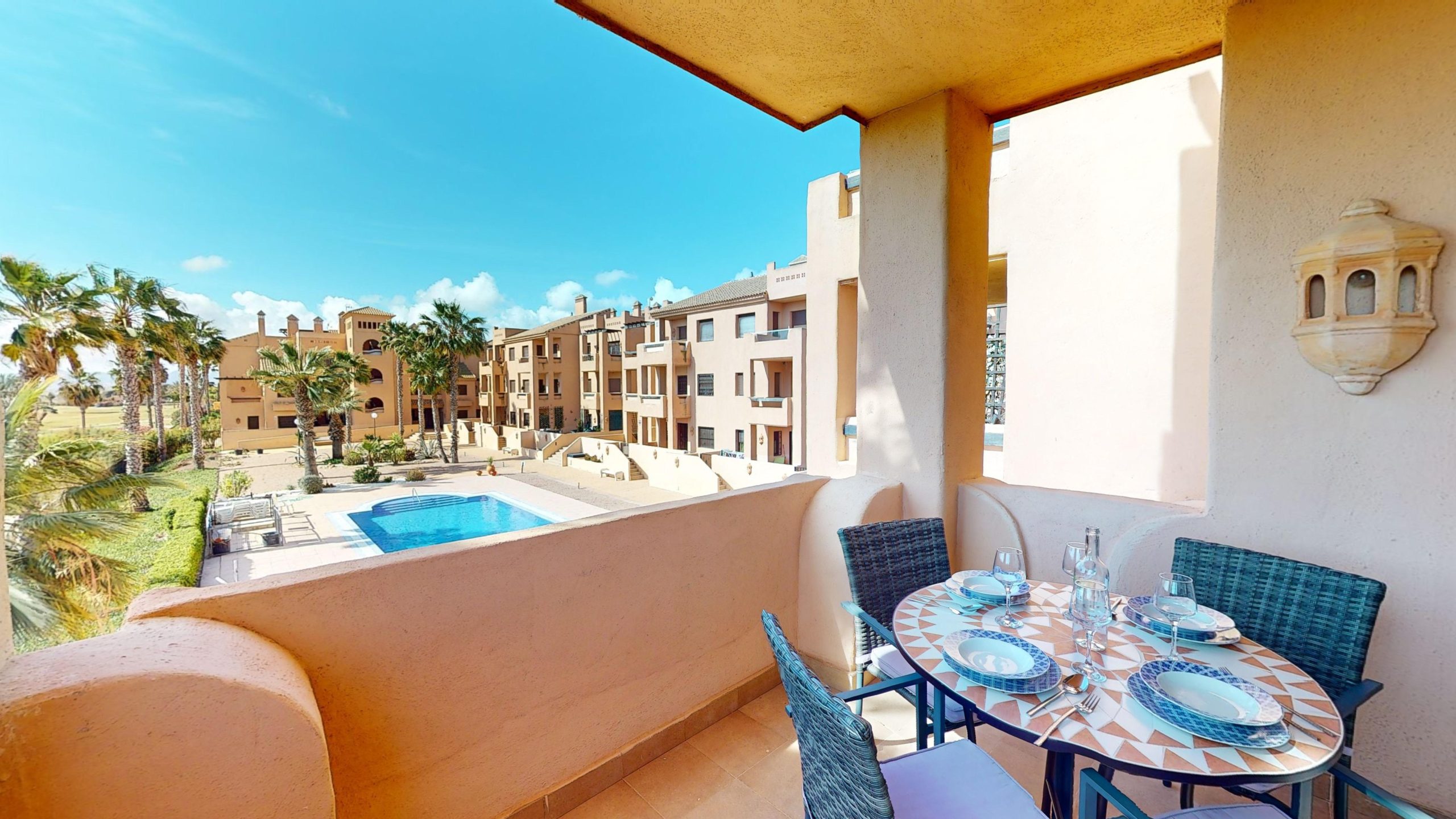This lovely 2-bedroom apartment has a capacity for 4 people and is located in the popular Serena Golf resort.The apartment has a southeast-facing position on the 3rd floor with a beautiful view of a picturesque lake, private pool area, and the golf green on hole 13. The apartment has a spacious 28 sqm terrace with direct access from the living room/kitchen and master bedroom.