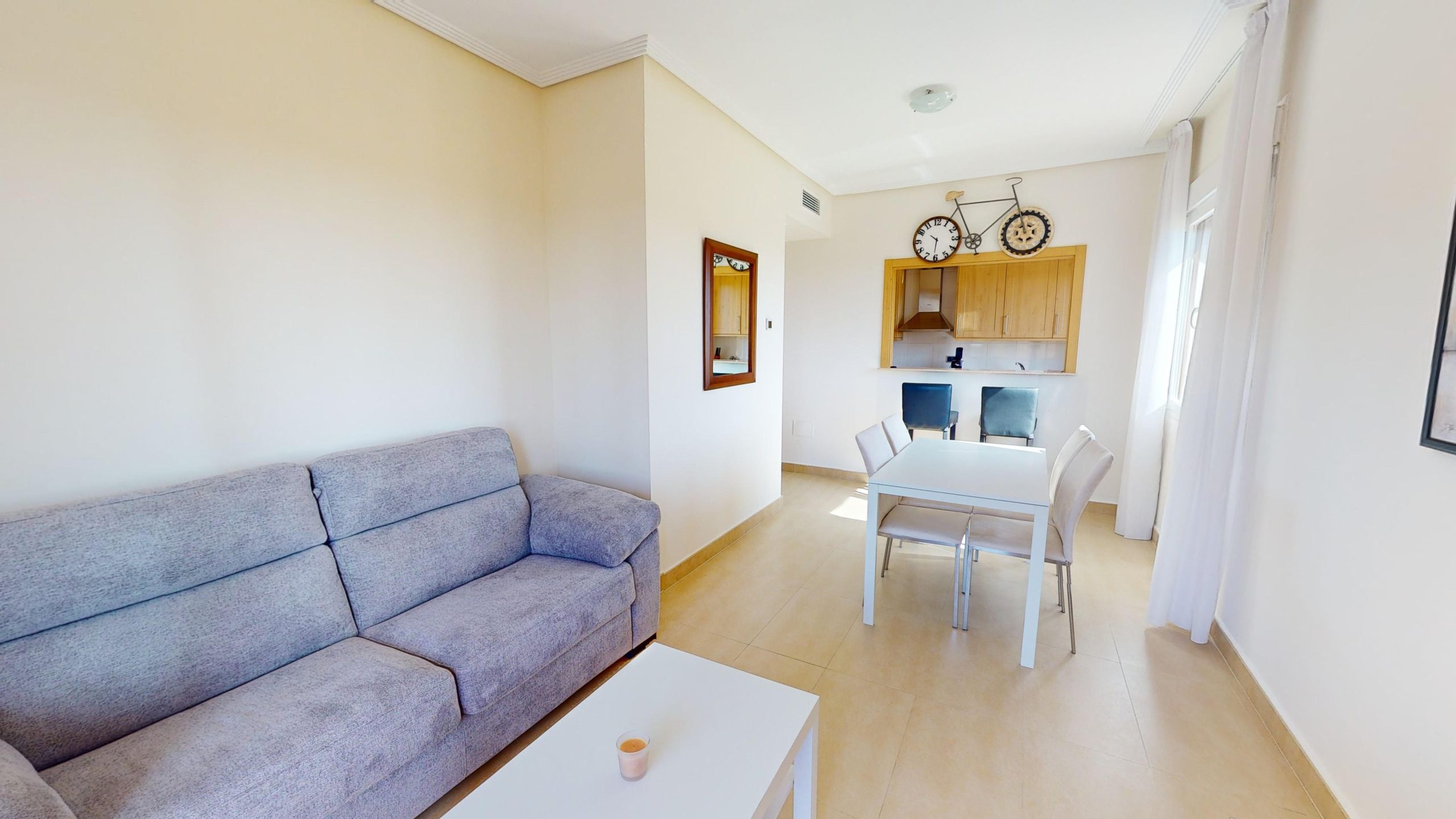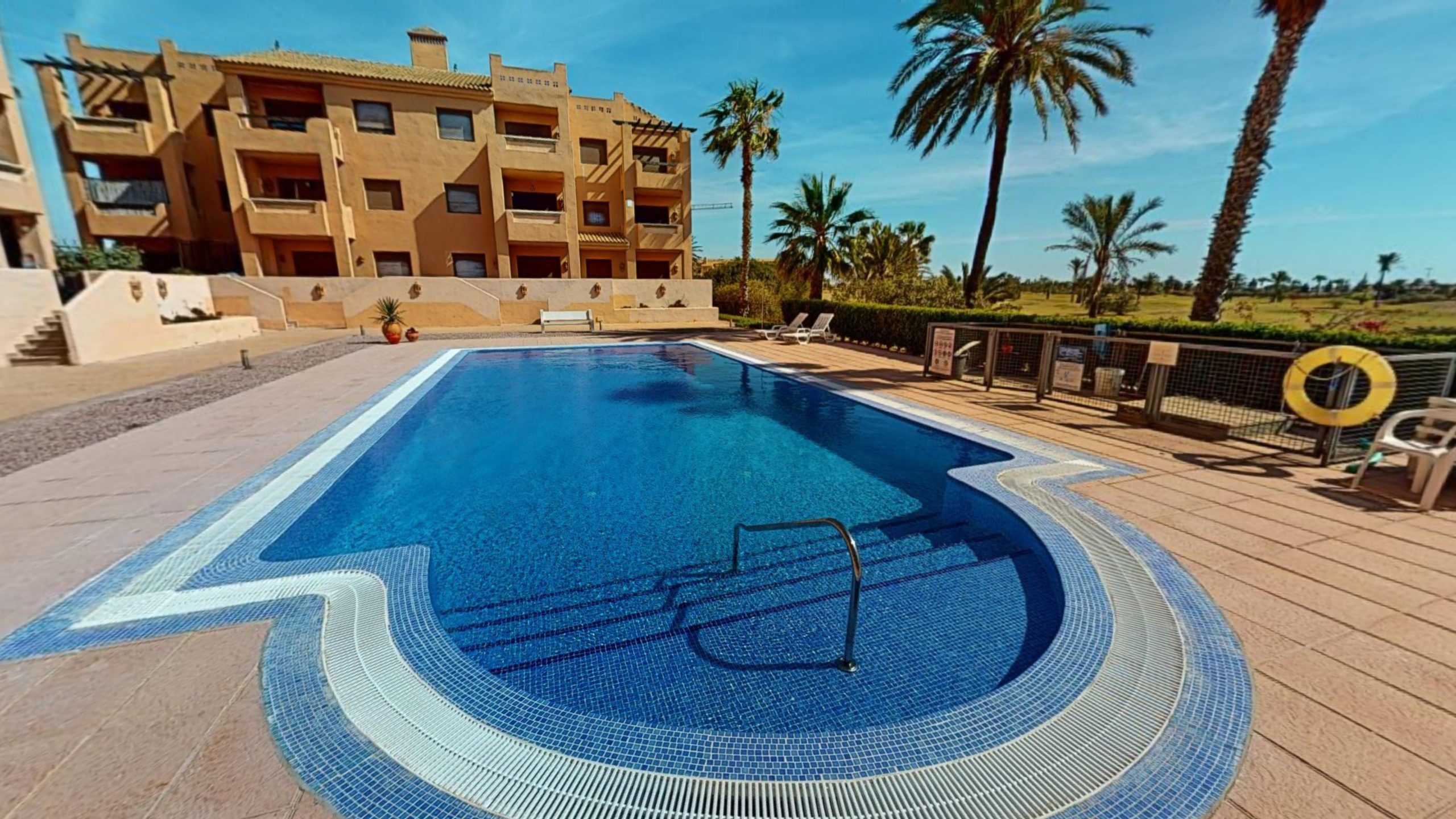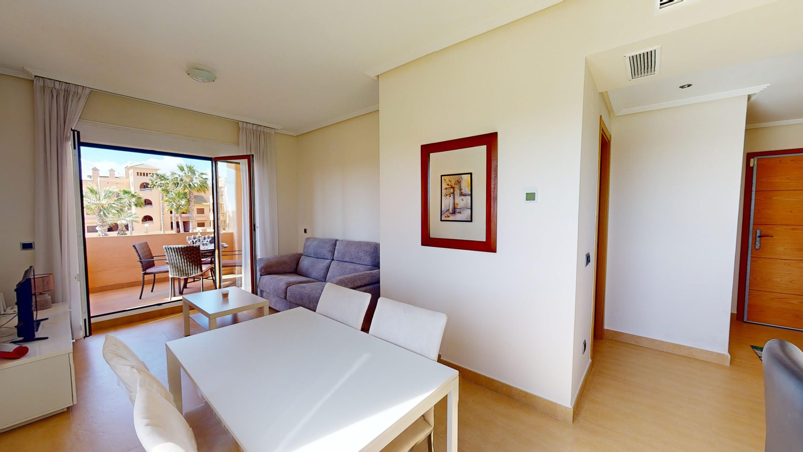 This lovely 2-bedroom apartment has a capacity for 4 people and is located in the popular Serena Golf resort.The apartment has a southeast-facing position on the 3rd floor with a beautiful view of a picturesque lake, private pool area, and the golf green on hole 13. The apartment has a spacious 28 sqm terrace with direct access from the living room/kitchen and master bedroom.